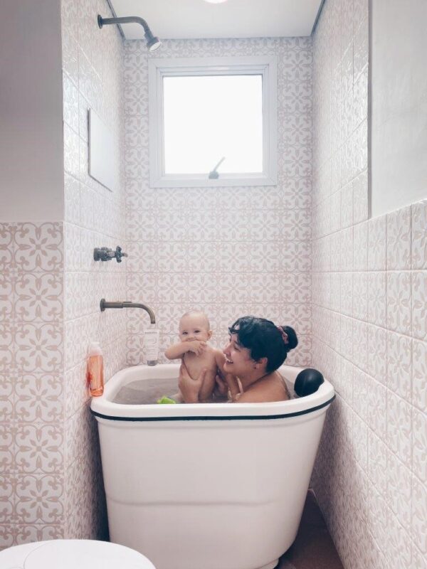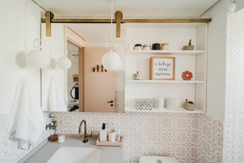 O casal de influenciadores Cami e Pablo, identificados nas redes sociais como apto.21, reformou o banheiro do apartamento onde moram, em São Paulo, com revestimentos que remetem ao passado, mas que trazem, ao mesmo tempo, muita modernidade. A responsável por essa transformação é a paleta escolhida – de tons bem atuais, como conta Camila. “O revestimento que escolhemos para as paredes já traz em si bastante história.” Austral Rosa, possui formato e estampas que lembram “casa de vó”, em suas palavras. O revestimento ao qual Cami se refere, tem formato 15x15cm e desenhos cujas formas trazem um ar floral e imprimem a delicadeza que o banheiro precisava.