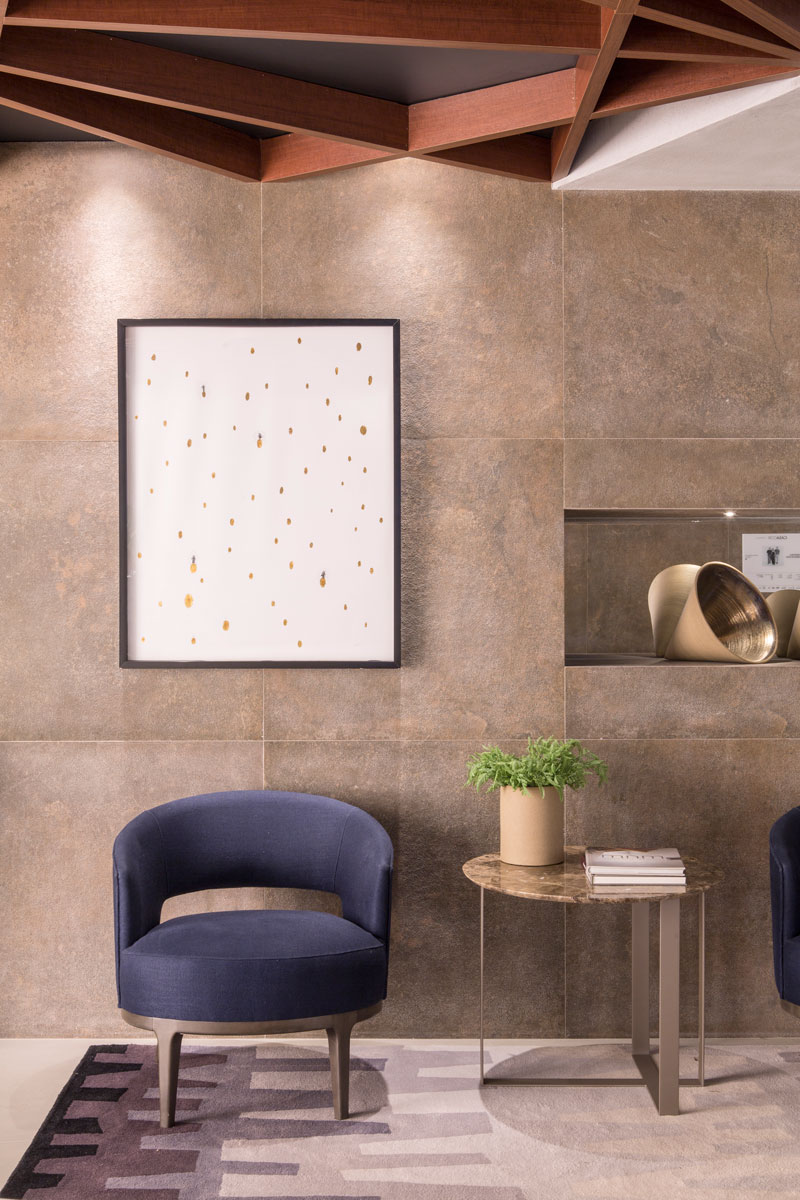 Para trazer aconchego, foi adotada na parede de entrada a tonalidade quente do porcelanato Aga Country, inspirado na beleza bruta da terra, com rusticidade e beleza natural, seguindo o rigor estético e textura fiéis às matérias-primas.