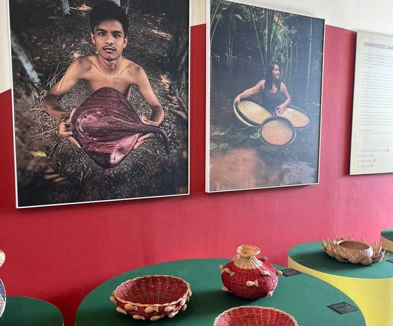 Outro elemento importante dessa cultura material, a trama indígena também compõe a exposição, dando origem a itens do dia a dia, como cestos, redes de pesca, tapetes, balaios, vasos – todos trançados, formando infinitos desenhos, com as matérias-primas da floresta.