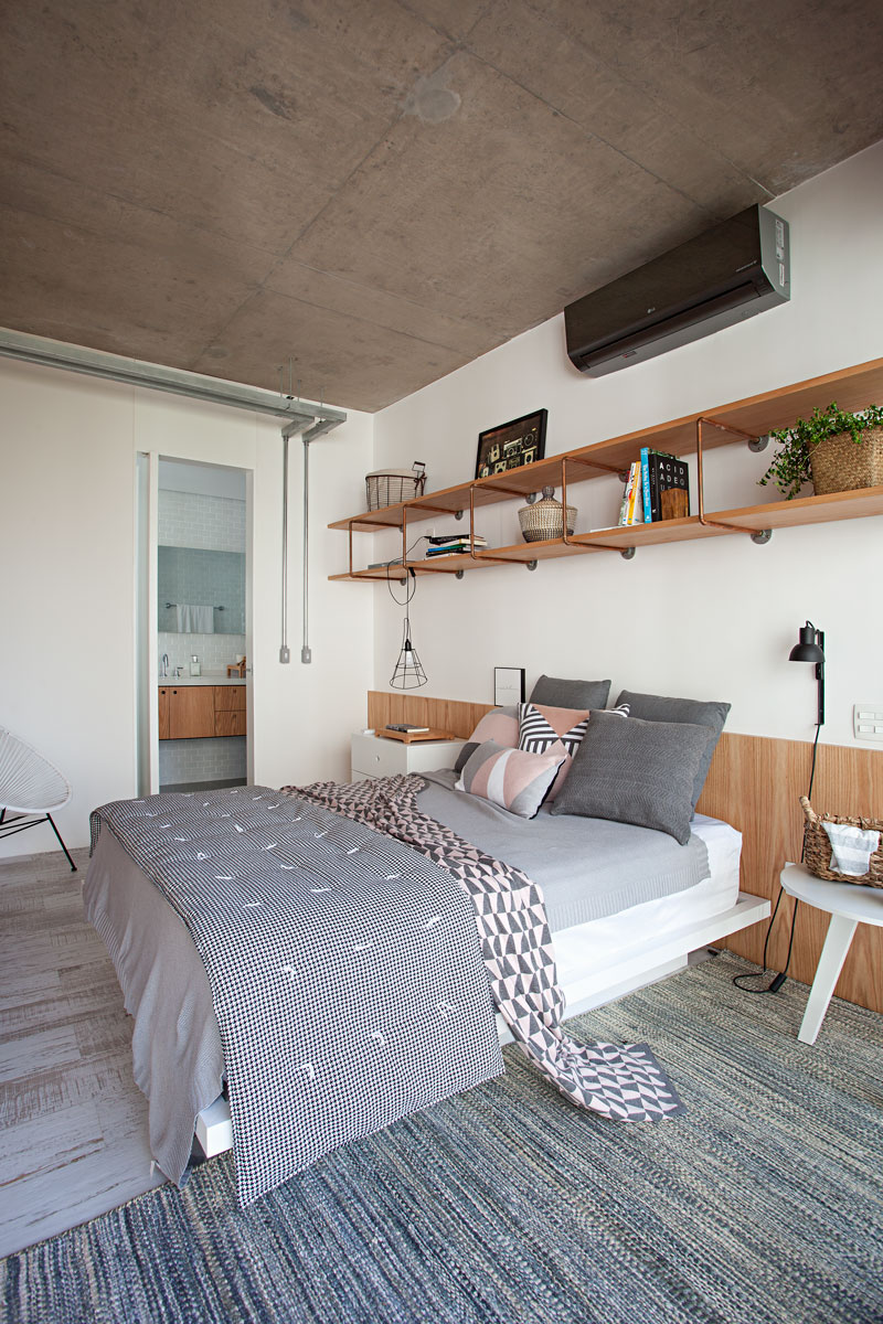 As referências do apê de 60m² são uma mistura entre o escandinavo e o industrial. Muito branco, madeira, cobre, concreto e tubulação aparente. Elementos característicos dos estilos que reinam nesse lar neutro e atual.
