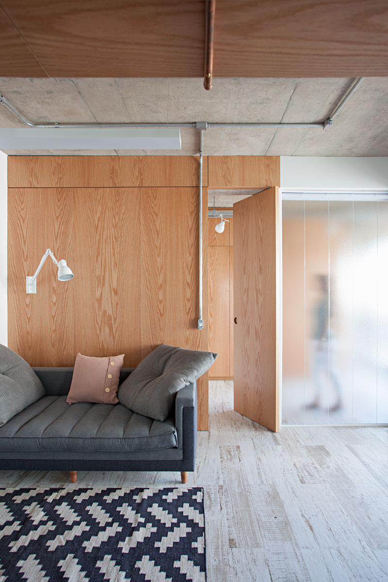 O projeto ganhou o nome de Apto das Divisórias, pois evidencia a integração de espaços sem utilizar paredes. Na sala de estar, por exemplo, uma divisória de carvalho americano separa os ambientes da área mais íntima da casa.